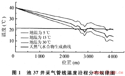 圖1為池37井在井口溫度為40℃時,不同地溫下的沿程溫度分布及天然氣水合物生成曲線圖。從圖上可以看到管線高程對管線沿線壓力、溫度影響非常大,而且隨著管線位置變化,壓力的變化引起各點(diǎn)的天然氣水合物生成溫度也發(fā)生了變化。管線進(jìn)站溫度最低,并不是在此處形成的天然氣水合物溫度最低,因此進(jìn)行管線設(shè)計(jì)時要綜合考慮預(yù)測天然氣水合物形成溫度,不能僅以終點(diǎn)不形成天然氣水合物,就認(rèn)為管線沿程都不生成天然氣水合物。