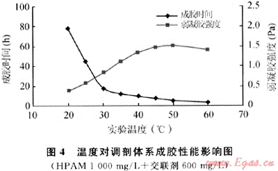 溫度是交聯(lián)化學(xué)反應(yīng)最敏感因素之一,尤其是對(duì)成膠時(shí)間的影響。在HPAM YG103弱凝膠交聯(lián)反應(yīng)中,過(guò)高的溫度會(huì)使弱凝膠破膠水化,筆者考察了30~50℃條件下調(diào)剖劑體系成膠性能的影響。實(shí)驗(yàn)中固定交聯(lián)體系配方,將體系溶液分別置于不同溫度的水浴中,定期觀測(cè)交聯(lián)體系的成膠時(shí)間及形成弱凝膠的強(qiáng)度。實(shí)驗(yàn)結(jié)果見圖4。