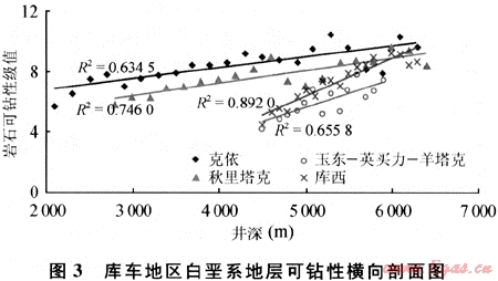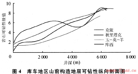 在古近系到白堊系,庫(kù)西地區(qū)地層可鉆性地層可鉆性較上部地層變小,與其他3個(gè)構(gòu)造區(qū)帶地層可鉆性變化趨勢(shì)相反,而其他3個(gè)構(gòu)造區(qū)帶地層可鉆性隨井深增加而有所增加。