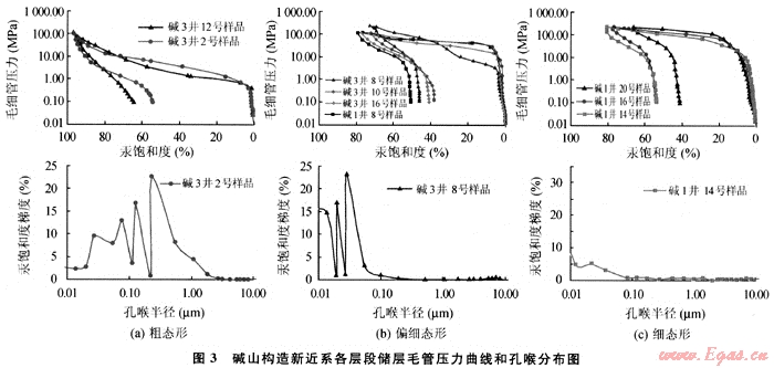 儲層孔隙結(jié)構(gòu)分為粗態(tài)型、偏細態(tài)型和細態(tài)型3種類型,整體排驅(qū)壓力較高(圖3),儲層主要流動喉道半徑較小,喉道孔徑主要分布在小于0.1μm的范圍,屬小孔-微細喉型,喉道系統(tǒng)較復(fù)雜,均勻程度差,分選不好,孔喉比大,喉道相當彎曲,因而排驅(qū)壓力和飽和度中值壓力高,退出效率低,充分表明儲層孔隙結(jié)構(gòu)差,故儲層滲透能力差,為差儲集層,不利于油氣的運聚。從縱向上整體來看滲流能力由上向下逐漸變差(表2)。根據(jù)裘亦楠、王允誠等確定的砂巖儲層分類評價方案所示,表明堿山構(gòu)造各儲層屬Ⅱ3-Ⅳ類儲層,即中下等到很差-差類儲層,這也是該區(qū)沒有形成規(guī)模聚集的主要原因之一[8~9]。