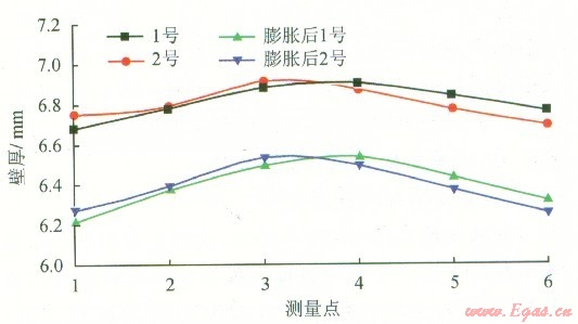 膨脹后套管的壁厚不均度會(huì)影響管材的使用性能,所以對(duì)膨脹前后管材的壁厚不均度都應(yīng)該嚴(yán)格控制。APl規(guī)定套管的壁厚不均度標(biāo)準(zhǔn)在12.5%以下,而管材冷加工的經(jīng)驗(yàn)標(biāo)準(zhǔn)為8%【5】,應(yīng)該以冷加工經(jīng)驗(yàn)作為膨脹管壁厚不均度的標(biāo)準(zhǔn)。