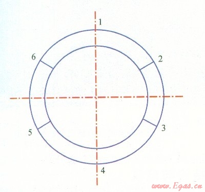 采用定點(diǎn)測(cè)量的方法(如圖2所示),即在j55套管端面選擇6個(gè)點(diǎn),分別測(cè)量并記錄膨脹前的壁厚值,待膨脹后依然只測(cè)量打標(biāo)記的6個(gè)點(diǎn)的壁厚值。