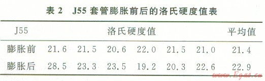 1)徑向膨脹使J55套管發(fā)生加工硬化,J55套管經(jīng)過(guò)9.3%的徑向膨脹后,洛氏硬度和抗拉強(qiáng)度分別增加7%和6.3%,而斷后伸長(zhǎng)率和斷面收縮率分別下降5.5%、3.6%,材料的韌性也有降低,但仍滿足API SPEC 5CT標(biāo)準(zhǔn)。