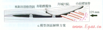 從實際地震剖面與物理模擬的結果對比圖(圖3-b、c)來看,該實驗基本將阿瓦特段的構造變形情況真實地再現(xiàn)了出來,物理模擬的構造形態(tài)與地震剖面基本一致:鹽下發(fā)育4排疊瓦逆沖斷層,與地震剖面一致;物理模擬剖面斷層傾角約30°,地震剖面斷層傾角40°,二者基本吻合。該實驗在邊界條件的設計上和構造變形的過程上與真實情況基本一致,符合相似性原則,可以作為對該地區(qū)構造解釋的有效證據(jù)。
