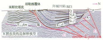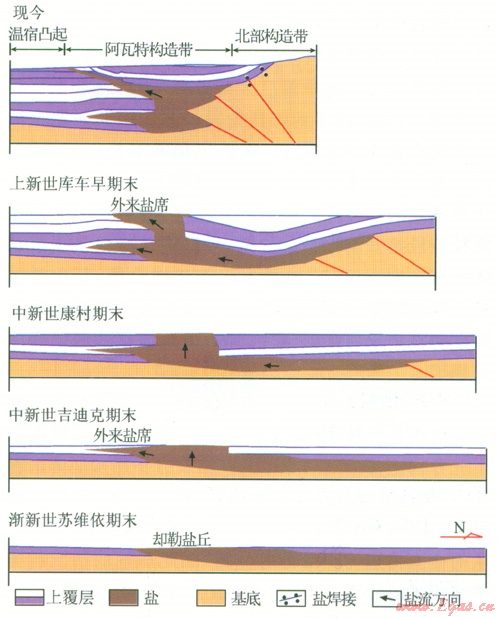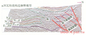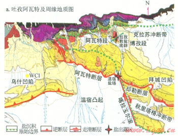 阿瓦特段北起北部構造帶,向南推覆到溫宿凸起之上,形成阿瓦特膏鹽巖推覆體。