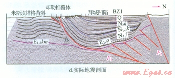基底變形將鹽上的向斜北翼整體抬升,最前端的斷層F1,位于向斜沉積中心北邊,角度約為40°,F(xiàn)1的南邊基底不再發(fā)生構造變形。鹽上地層在初始鹽底辟位置發(fā)育了推覆距離很大的前緣逆沖斷層,并持續(xù)活動。以該前緣斷層為界,北端發(fā)育為鹽撤凹陷,呈巨大的向斜形態(tài),向斜的南北兩翼均可見紅白色石英砂逐漸減薄,為典型的生長地層形態(tài),代表伴隨擠壓的同構造沉積地層,前緣斷層上盤是博孜段淺層向斜的南翼。前緣斷層南端為幅度較小的卻勒區(qū)塊的米斯坎塔克背斜,背斜的北翼即為推覆體的下盤,南翼是未變形的鹽上沉積。