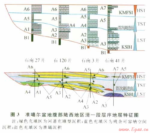 細(xì)的河道型沉積,緊鄰A3之上發(fā)育一套薄泥巖,在電阻率曲線(xiàn)上顯示一個(gè)明顯的低阻特征,指示首次大規(guī)模的湖進(jìn)面。水進(jìn)體系域以正常河流三角洲沉積(A4)體系為主,隨后發(fā)育了以粉砂巖為主的砂泥巖薄互層沉積(A5),顯示湖平面上升早中期的垂向加積為主的沉積特征,在A(yíng)5之上發(fā)育薄的質(zhì)純高伽馬值泥巖,指示最大湖泛面位置KMFS1(也是一個(gè)下超面和視不整合面),上覆高含砂率的巖性組合(A6)指示高位體系域的進(jìn)積沉積體系[3]。