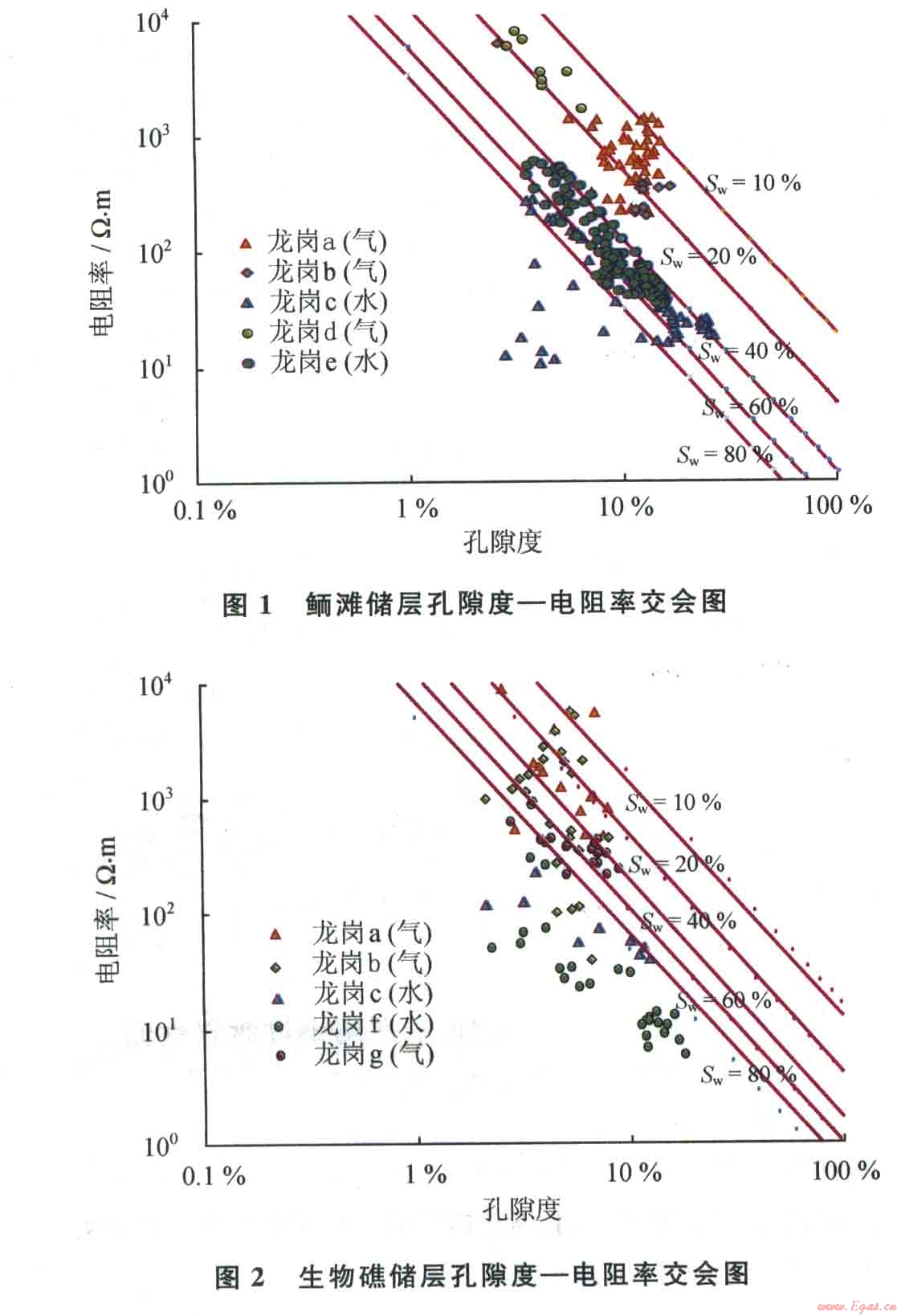 這是一組截距僅隨Sw而變的直線,輸入龍崗地區(qū)白云巖儲層的巖性骨架參數(shù)和Rw值,建立該區(qū)孔隙度一電阻率交會圖版(圖1、2),根據(jù)交會點子分布范圍判別儲層流體類型。