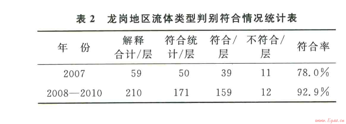 3應(yīng)用效果 將復(fù)雜礁灘氣藏儲層流體識別的上述技術(shù)應(yīng)用于龍崗地區(qū),取得了很好的效果。2008年以前,傳統(tǒng)方法判別符合率僅78%,2008年到2010年通過新方法的應(yīng)用,解釋符合率得到了極大的提高,根據(jù)該氣藏飛仙關(guān)組和長興組已試油證實產(chǎn)流體情況的210層來看,符合統(tǒng)計要求的共l71層,符合l59層,不符合12層,流體類型判別符合率平均達(dá)到92.9%(表2)。