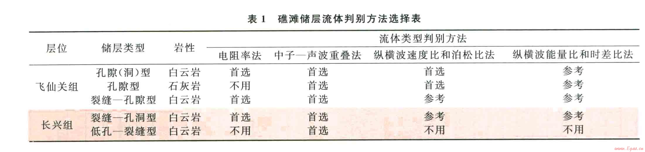 以上研究表明,每種流體識別方法均有各自的特點和適用性,為便于現(xiàn)場生產(chǎn)中應(yīng)用,針對龍崗地區(qū)飛仙關(guān)組和長興組的不同巖性、不同儲集類型儲層確立了最優(yōu)的流體判別方法優(yōu)選(表1):飛仙關(guān)組儲層可選擇電阻率法、中子聲波重疊法、縱橫波速度比或泊松比法、縱橫波能量比和時差比重疊法來判別流體類型;長興組儲層可選擇電阻率法、中子一聲波重疊法來判別流體類型,縱橫波速度比或泊松比法、縱橫波能量比和時差比重疊法可以作為參考。