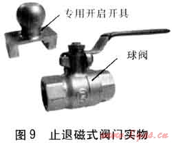圖9所示的閥門,針對市場普通的可控式燃?xì)忾y門在完全關(guān)閉狀態(tài)前球閥已經(jīng)密封但未完成進(jìn)入可控區(qū)域時,用戶還可以逆時針開啟球閥的缺陷而設(shè)計。該閥門是可實現(xiàn)提前角度可關(guān)不可開功能的止退磁式產(chǎn)品。球閥開啟狀態(tài)時手柄與管道軸線呈0°,球閥關(guān)閉狀態(tài)時手柄與管道軸線呈90°,手柄應(yīng)順時針關(guān)閉球閥,逆時針開啟球閥,手柄在球閥已密封但未完全關(guān)閉狀態(tài)位置與關(guān)閉狀態(tài)手柄位置形成的角度即為提前角度。止退指關(guān)閉過程中只能夠順時針操作。閥門關(guān)閉狀態(tài)必須通過專用開啟工具才能實現(xiàn)可自由開啟。該結(jié)構(gòu)關(guān)鍵技術(shù)在于閥體凸頸沿徑向?qū)ΨQ兩側(cè)面各外伸一個凸臺,在兩凸臺分別開設(shè)通孔,分別在通孔一端封閉且設(shè)有磁銷和彈簧;閥桿外側(cè)壁的相對兩側(cè)面上分別開設(shè)兩個盲孔,盲孔設(shè)有限位槽以及提前角度止退結(jié)構(gòu)。當(dāng)閥從開啟轉(zhuǎn)向關(guān)閉狀態(tài)過程中,閥體與閥桿配合進(jìn)入預(yù)設(shè)提前角度止退區(qū)域時(符合歐洲BS EN 331:1998《建筑物燃?xì)夤?yīng)設(shè)備用手動球閥和密封底部錐體旋塞閥》規(guī)定的8°±1°夾角要求),閥體凸臺兩通孔內(nèi)設(shè)置的磁銷通過彈簧力進(jìn)入鎖定且止退狀態(tài)直至完全鎖定狀態(tài),實現(xiàn)提前角度止退可關(guān)不可開的功能;當(dāng)閥從關(guān)閉到開啟狀態(tài),需要通過專用開啟工具內(nèi)的強(qiáng)磁與閥內(nèi)的磁銷通過磁場“同性相斥,異性相吸”的原理方可開啟閥門。產(chǎn)品出廠時一般設(shè)置為開啟狀態(tài)。