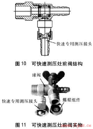 圖10、11所示閥門為可實現(xiàn)不用關(guān)閉或切斷管道燃?xì)獾那闆r下進(jìn)行快速測壓的燃?xì)忾y門。不要測壓時,灶前閥處于開啟狀態(tài),測壓裝置處于常自閉狀態(tài),即密封狀態(tài)。需要測壓時,只需逆時針擰下螺帽組件,將快速專用測壓接頭連接到測壓接口,使快速專用測壓接頭接觸預(yù)設(shè)測壓工作區(qū)域,并逐步順時針擰緊,推動閥芯壓縮彈簧向內(nèi)移動,使測壓接口內(nèi)的密封口脫離密封臨界設(shè)置同時達(dá)到無外泄漏,從而使燃?xì)忭樌鲃?。?dāng)測壓完畢后,將快速專用測壓接頭逆時針擰出測壓接口,密封墊在彈簧的作用下迅速歸位,達(dá)到無泄漏狀態(tài),擰緊螺帽組件進(jìn)行保險密封,可以實現(xiàn)快速、安全地進(jìn)行測壓作業(yè)。該產(chǎn)品公稱壓力不大于1.6MPa,工作溫度為-20~120℃。