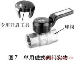 圖7閥門為可實現(xiàn)可關(guān)不可開功能的單用磁式閥門,閥門關(guān)閉后只能通過專用開啟工具才能實現(xiàn)自由開啟。該結(jié)構(gòu)關(guān)鍵技術(shù)在于閥體有扇形凸臺,在扇形凸臺的軸向端和徑向端分別設(shè)置相垂直的兩個盲孔,手柄按閥體扇形凸臺徑向和軸向相垂直盲孔對應(yīng)位置分別開設(shè)相對應(yīng)的盲孔。閥體扇形凸臺上軸向和徑向盲孔和手柄內(nèi)的磁銷、彈簧能準(zhǔn)確地按對應(yīng)預(yù)設(shè)盲孔插入,即可實現(xiàn)可關(guān)不可開功能。當(dāng)閥門需要正常工作時,只能通過專用開啟工具內(nèi)的強(qiáng)磁與閥內(nèi)的磁銷通過磁場“同性相斥,異性相吸”的原理實現(xiàn)自由開啟閥門。產(chǎn)品出廠時一般設(shè)置為開啟狀態(tài)。