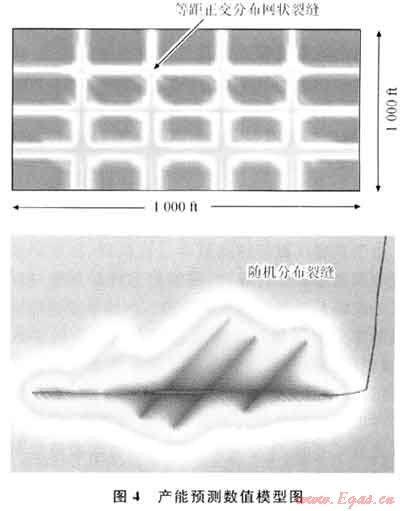 Bruce等[8]建立了線網(wǎng)模型,采用正交的橢球面模擬網(wǎng)狀裂縫面,裂縫在空間上呈三維分布互相正交;考慮了穩(wěn)態(tài)和擬穩(wěn)態(tài)流動(dòng)的情況,計(jì)算出了產(chǎn)能預(yù)測(cè)圖版。Cipolla等[9]建立了等距分布正交分布的網(wǎng)狀裂縫產(chǎn)能預(yù)測(cè)模型,采用SRV方法計(jì)算改造體積。模擬計(jì)算中考慮了支撐劑的分布形態(tài)(支撐裂縫和未支撐裂縫),滲流模式(解吸附、達(dá)西滲流和非達(dá)西滲流)以及裂縫參數(shù)對(duì)產(chǎn)能的影響。Williams等[10]通過裂縫識(shí)別技術(shù)確認(rèn)裂縫面和裂縫數(shù)量;結(jié)合成像測(cè)井確定的裂縫方位,建立裂縫分布模型后簡(jiǎn)化為氣藏?cái)?shù)值模擬模型,通過歷史擬合進(jìn)行模型校正和參數(shù)優(yōu)化。