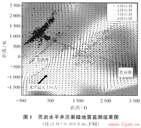 常規(guī)壓裂形成的裂縫一般呈雙翼對(duì)稱裂縫的形式。但頁(yè)巖氣壓裂中微地震監(jiān)測(cè)的結(jié)果表明,裂縫的形態(tài)復(fù)雜多變,如圖1所示[2]。1口水平井壓裂后微地震監(jiān)測(cè)結(jié)果表明,第1、2段壓裂施工形成了垂直于水平井段的平面縫,第3、4段施工形成了網(wǎng)狀裂縫。目前認(rèn)為頁(yè)巖氣壓裂目的,就是要建立一個(gè)獨(dú)立于傳統(tǒng)意義裂縫半長(zhǎng)的更加龐大的裂縫網(wǎng)絡(luò)系統(tǒng),實(shí)現(xiàn)更大規(guī)模的儲(chǔ)層改造波及體積;生產(chǎn)實(shí)踐也證明了儲(chǔ)層改造體積越大壓后增產(chǎn)效果越好。