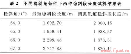 通過(guò)簡(jiǎn)化式可試算出最大穩(wěn)斜角,即假設(shè)一個(gè)穩(wěn)斜角αc,對(duì)應(yīng)算出一個(gè)穩(wěn)斜段長(zhǎng)度Lw,然后與設(shè)計(jì)井在該穩(wěn)斜角下確定的圓弧軌道穩(wěn)斜段對(duì)比結(jié)果見(jiàn)表2,確定出最大穩(wěn)斜角αcmax=65.00°。