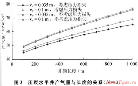 圖3為不同井筒半徑下,產(chǎn)氣量隨井筒長度的變化關(guān)系??梢钥闯觯壕查L度相同時,井筒半徑越小,對產(chǎn)能的影響也越大,影響的幅度也越明顯;當井筒半徑大到一定的值后,井筒內(nèi)壓力損失所造成的產(chǎn)量降低將不再明顯。在相同井筒半徑和裂縫條數(shù)下,壓裂水平井的產(chǎn)量不與水平段的長度成正比,當水平段長度達到一定的值后,產(chǎn)量的增加將變得緩慢。