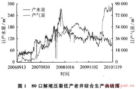 針對(duì)煤層氣排采過程中煤層滲透性低、易造成煤粉堵塞的情況,為恢復(fù)儲(chǔ)層滲透性、提高低效井單井產(chǎn)量,開展了低產(chǎn)井大液量、高排量壓裂增產(chǎn)技術(shù)。特別是2008年以來,針對(duì)不同的傷害原因,結(jié)合煤巖結(jié)構(gòu)特征,開展了不同規(guī)模的二次重復(fù)壓裂試驗(yàn)研究,逐步發(fā)展完善形成了自己特有的二次壓裂解堵性壓裂增產(chǎn)技術(shù)。該技術(shù)可有效清除近井地帶的煤粉沉積、改善因應(yīng)力變化而發(fā)生變形或者閉合的微孔隙,重新建立起與遠(yuǎn)端溝通的通道;同時(shí)還可有效地解除氣鎖和膠結(jié)的煤粉的影響,防止煤層的進(jìn)一步垮塌。2009年底至2010年規(guī)模實(shí)施二次壓裂解堵井80口(圖1),平均單井日增產(chǎn)1000m3左右。目前煤層氣解堵性壓裂工藝技術(shù)已經(jīng)從局部實(shí)驗(yàn)階段走向全面現(xiàn)場(chǎng)應(yīng)用階段,具有較強(qiáng)的適應(yīng)性和針對(duì)性,取得了較好的增產(chǎn)效果和可觀的經(jīng)濟(jì)效益。