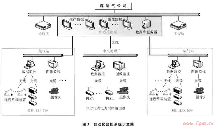 采用SCADA系統(tǒng)對(duì)全區(qū)生產(chǎn)運(yùn)行分單井-集氣站-處理中心3級(jí)監(jiān)控和運(yùn)營(yíng)管理(圖3),集氣站采用以計(jì)算機(jī)控制技術(shù)為核心的站控系統(tǒng)(SCS),完成站場(chǎng)內(nèi)工藝過程的數(shù)據(jù)采集和監(jiān)控任務(wù),采氣井場(chǎng)設(shè)置SCADA系統(tǒng)遠(yuǎn)程終端裝置(RTU),將井口數(shù)據(jù)通過無線寬帶+光纜傳輸?shù)姆绞絺髦翑?shù)據(jù)中心。實(shí)現(xiàn)了生產(chǎn)管理的智能化,減少了30%的用工總量,保障了系統(tǒng)平穩(wěn)運(yùn)行,提高了管理水平和工作效率。