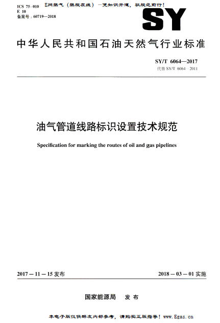 油氣管道線路標(biāo)識設(shè)置技術(shù)規(guī)范SY/T 6064-2017 :本標(biāo)準(zhǔn)代替SY/T 6064 2011 《管道干線標(biāo)記設(shè)置技術(shù)規(guī)范》,與SY/T 6064- 2011 相比,除編輯性修改外,主要技術(shù)變化如下: