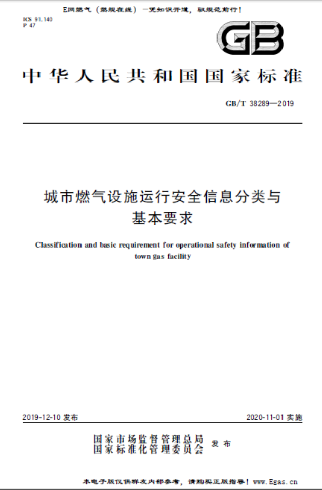 城市燃?xì)庠O(shè)施運(yùn)行安全信息分類與基本要求GB∕T 38289-2019 本標(biāo)準(zhǔn)規(guī)定了城市燃?xì)庠O(shè)施運(yùn)行安全信息的術(shù)語(yǔ)和定義.基本原則,分類和基本要求。