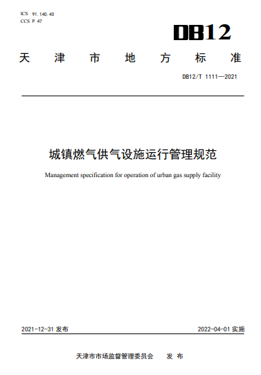 天津地標:城鎮(zhèn)燃氣供氣設(shè)施運行管理規(guī)范DB12/T 1111—2021