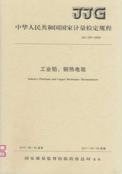 工業(yè)鉑、銅熱電阻檢定規(guī)程JJG 229-2010:本規(guī)程適用于-200℃~+850℃整個或部分溫度范圍使用的溫度系數(shù)α 標(biāo)稱值為3.851×10-3℃-1的工業(yè)鉑熱電阻和-200 ℃~+850 ℃整個或部分溫度范圍使用的溫度系數(shù)α 標(biāo)稱值為4.280×10-3℃-1的工業(yè)銅熱電阻的首次檢定、后續(xù)檢定和使用中檢驗。
