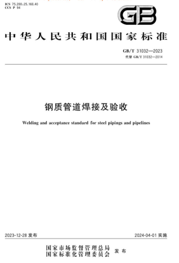 鋼制管道焊接及驗收國標/T 31032-2023 摘 要 鋼制管道焊接及驗收GB/T 31032-2023 《鋼制管道焊接及驗收》GB/T 31032-2023標準于2023年12月28日發(fā)布,將于2024年4月1日起實施,本文件代替 GB/T 31032-2014《鋼質管道焊接及驗收》,與GB/T31032-2014相比,除結構調整和編輯性改動外,主要技術變化如下: a)更改了適用范圍,將適用介質中的“燃氣”改為“天然氣”,將適用范圍“輸送管線、管網、閥室和站場”改為“長輸管道、集輸管道”,刪除了“氣焊”焊接方法,增加了X射線數(shù)字成像檢測、X射線計算機輔助成像檢測等驗收要求(見第1章,2014年版的第1章); b)刪除了“業(yè)主”“承包商”“根焊”“返修”“焊縫”“顯示”“合格焊工”“焊工考試”“焊接工藝評定”的術語和定義(見2014年版的3.1、3.2、3.5、3.9、3.12、3.16、3.18、3.19、3.21); c)增加了“焊接工藝評定報告”“自動焊”“根焊道”“背面焊”“返修焊”“全壁厚返修”“部分壁厚返修”“背面內返修”“二次返修”“修補”“焊接熱輸人”“預熱溫度”“道間溫度”“焊后熱處理”“空心焊道”“回火焊道”“堆焊修復”的術語和定義(見 3.2、3.5、3.10、3.11、3.15~3.24、3.28~3.30); d)更改了“預焊接工藝規(guī)程”“焊接工藝規(guī)程”“機動焊”“旋轉焊”“固定焊”“缺陷”“內凹”術語的定義(見 3.1、3.3、3.4、3.7、3.8、3.26、3.27,2014年版的 3.20、3.22、3.3、3.10、3.11、3.15、3.17); e)增加了縮略語(見第4章); f)增加了人員、焊接工藝、焊接環(huán)境的內容(見第5章); g)更改了對管材及管件的具體要求(見5.2.1,2014年版的4.2.1): h)更改了填充材料類型和規(guī)格(見5.2.2.1,2014年版的4.2.2.1); i)更改了焊接工藝評定基本要素,增加了夏比沖擊韌性試驗、宏觀金相試驗、拉伸試驗、背彎和面彎試驗、側彎試驗、SSC 試驗、HIC試驗、CTOD試驗、硬度試驗的方法及要求等內容(見第6章,2014年版的第5章): j)更改了上崗考試方法、單一考試適用壁厚范圍,增加了支管連接單一考試技術要求等內容(見第7章,2014年版的第6章): k)更改了管口組對錯邊量要求、焊縫外觀檢查尺寸要求,增加了不等壁厚對接焊口坡口形式、對口器使用要求等內容(見第8章,2014年版的第7章); l)更改了無損檢測人員要求,增加了X射線數(shù)字成像檢測、X射線計算機輔助成像檢測、相控陣超聲檢測、全自動超聲檢測等方法(見第9章,2014年版的第8章); m)增加了X射線數(shù)字成像檢測、X射線計算機輔助成像檢測、相控陣超聲檢測、全自動超聲檢測等評定要求,更改了射線檢測氣孔、磁粉檢測圓形缺陷、滲透檢測圓形缺陷、超聲檢測體積缺陷評判指標等內容(見第10章,2014年版的第9章); n)增加了返修要求、返修焊的焊接工藝評定基本要素、返修焊規(guī)程、返修焊工上崗考試等內容(見第11章); o)增加了X射線數(shù)字成像檢測、X射線計算機輔助成像檢測、相控陣超聲檢測、全自動超聲檢測等內容,更改了射線檢測、超聲檢測等內容(見第12章,2014年版的第11章); p)更改了機動焊焊接工藝規(guī)程、機動焊焊接工藝評定基本要素,機動焊焊工上崗考試等內容(見第13章,2014年版的第12章); q)更改了工程臨界評估的相應內容(見附錄A,2014年版的附錄C); r)更改了在役管道焊接的相應內容(見附錄B,2014年版的附錄D); s)更改了推薦記錄表格(見附錄C,2014年版的附錄E)。 在線下載列表 會員下載需要E點:0 群友會員無限制瀏覽 文章導航 贊 賞 分享 您可以選擇一種方式贊助本站 支付寶轉賬贊助 微信轉賬贊助 注解:本資料由會員及群友提供僅供閱讀交流學習,不得用于商業(yè)用途! 網站VIP會員無限制下載網站資料!贊助網站獲得,點擊贊助??! 焊接施工工藝與操作系列叢書:碳素鋼 焊工入門考證一本通(焊工考證一本 城鎮(zhèn)燃氣輸配工程施工及驗收標準國 石油天然氣建設工程施工質量驗收規(guī) < 上一篇 石油天然氣工業(yè) 管線輸送系統(tǒng)用鋼管國標/T 9711-2023 下一篇 > 《先導式安全閥》國標/T 28778—2023 文章導航
